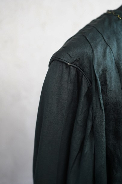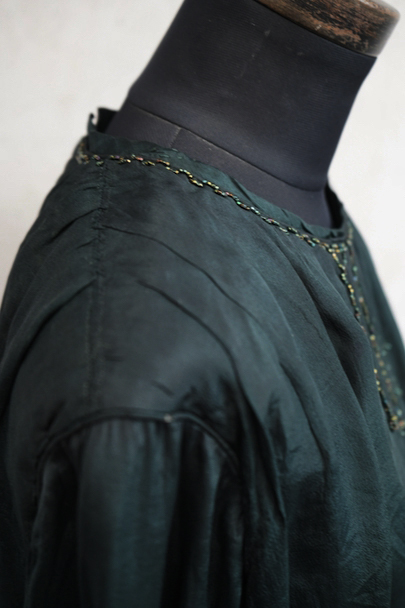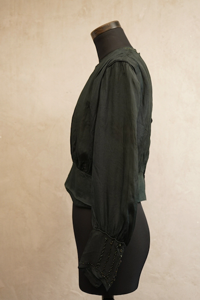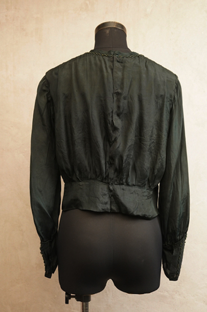 1910年代から1920年代頃につくられたブラウス。深いグリーンのシルク生地が美しい品です。ネックと袖口に縫い付けられたビーズが上品です。バックをスナップボタンで留める仕様。画像では分かりにくいですが、バックの上から4個目のスナップ横に黒い汚れがあります。その他、ビーズが外れた部分、小さな擦れが数か所、糸のほつれ、点のような穴があるなど、経年の傷みがありますが、年代と素材を考えると状態は良いと思います。傷みは目立つものではないですが、ダメージを気にされない方にお勧めします。