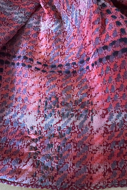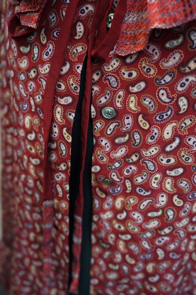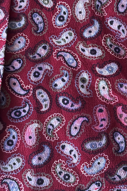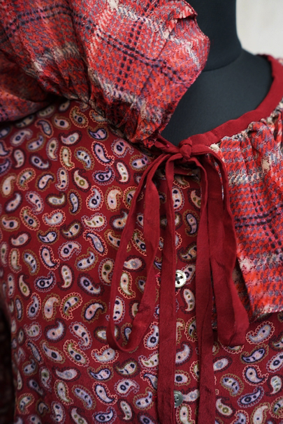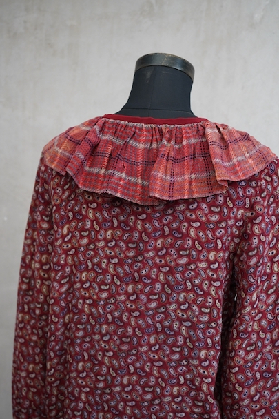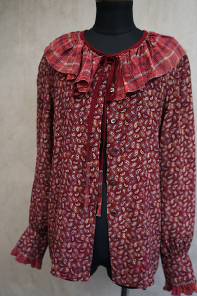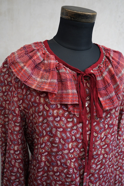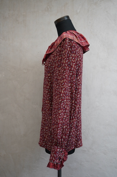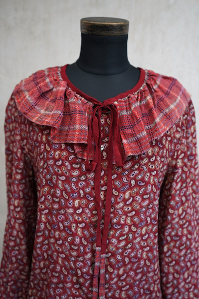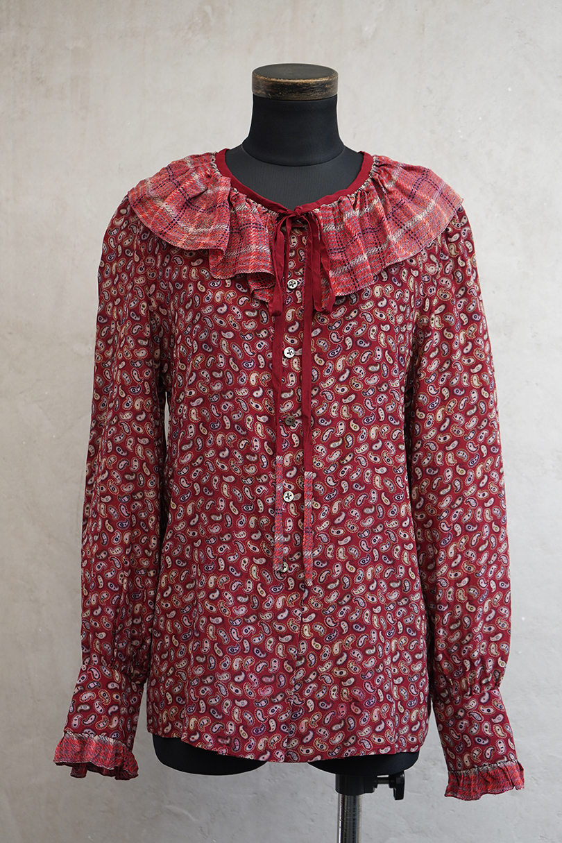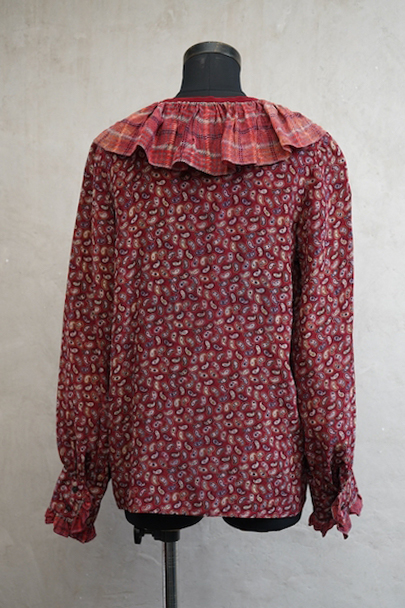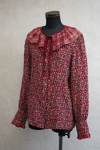 深い赤色にペイズリー柄プリントのブラウス。1940年代頃につくられたものだと思います。柔らかで軽い良い質感のシルク素材です。チェック柄のフリル部分に手縫いの直し痕、その他ネック部分に小さな直し、点のような小さな穴、赤色に染まったような色むらがあります。ダメージは分かりにくく汚い印象は無いと思いますが、ダメージを気にされない方にお勧めします。