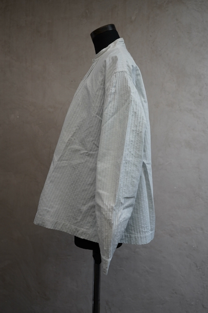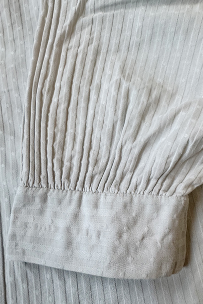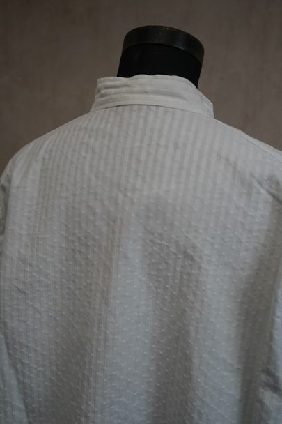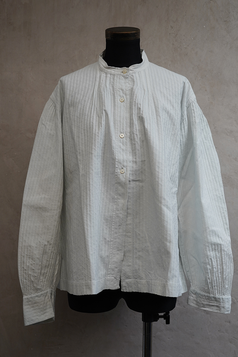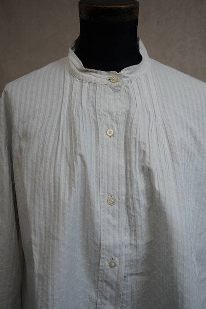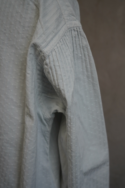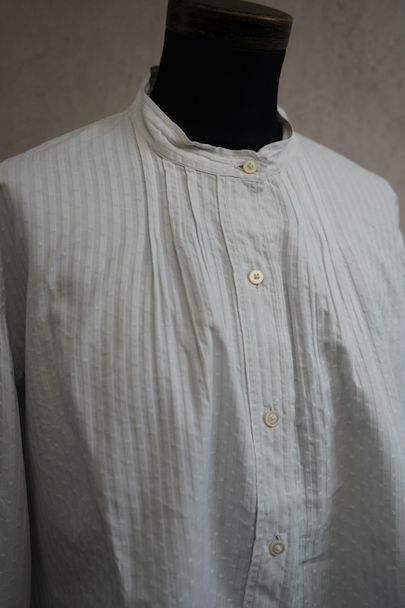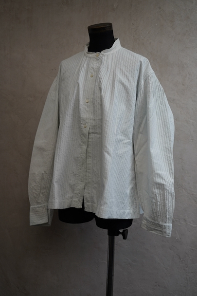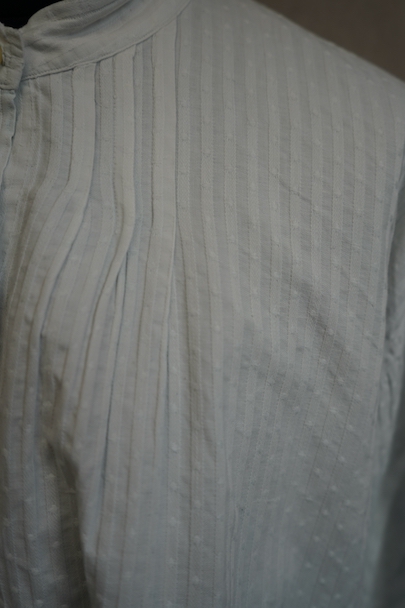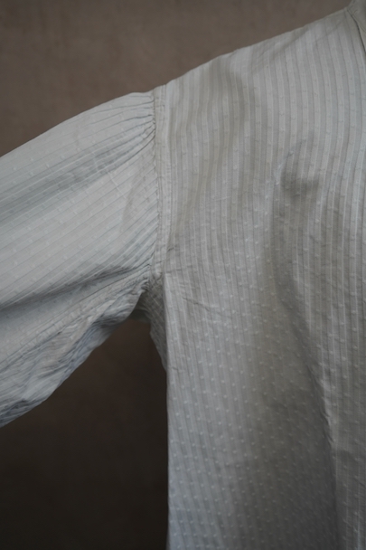 20世紀初期頃までにつくられたアンティーク・ブラウス。ストライプとドットの織柄が珍しいコットン素材の布地です。肩の落ちる仕様で、カーブした裾、Aラインに広がる良いシルエットです。ボタンはシェル製、ボタンホールは手縫いです。裾近くに小さく点のような穴が2個あります。目立つものではありませんが、ダメージを気にされない方におすすめです。