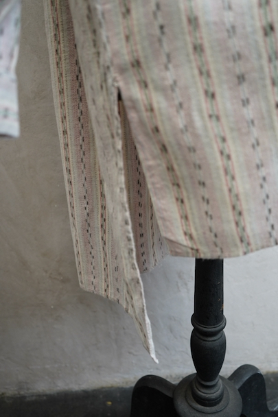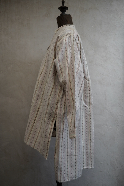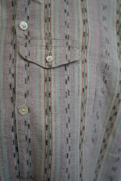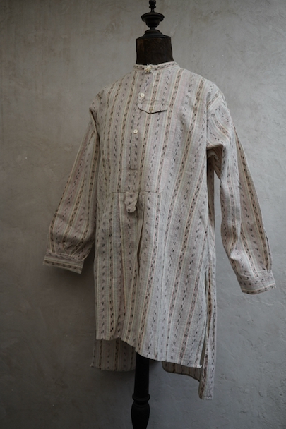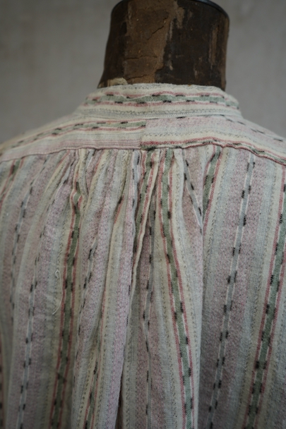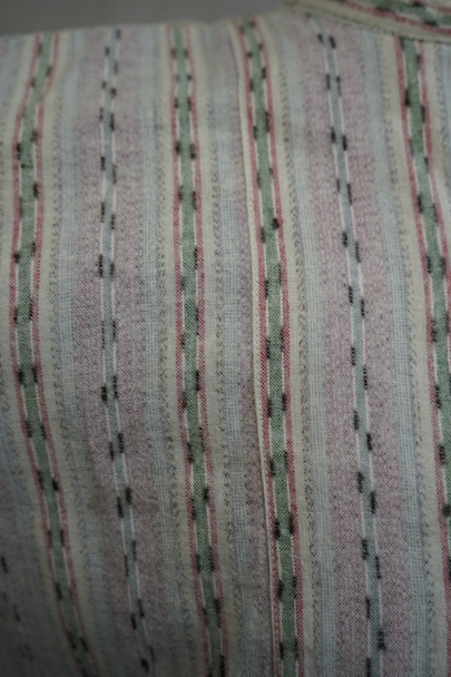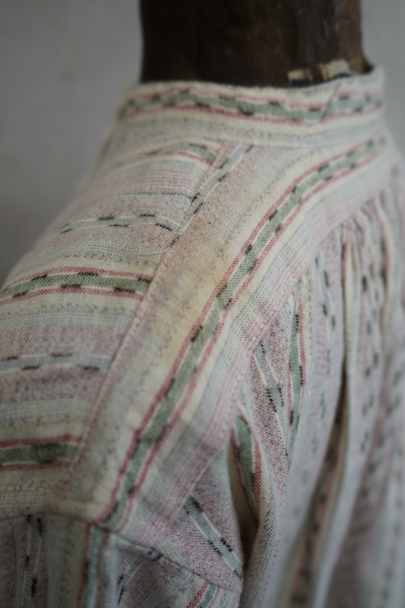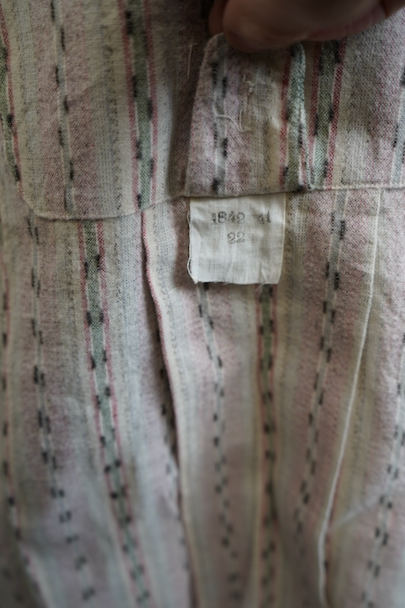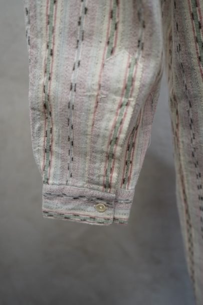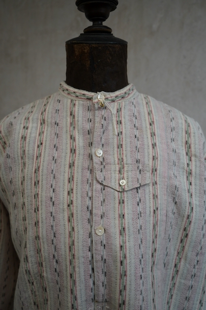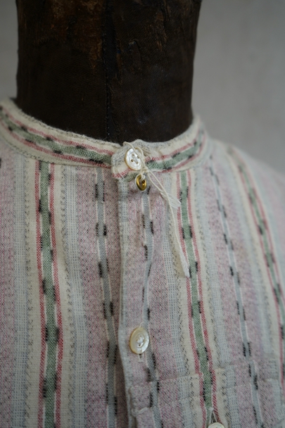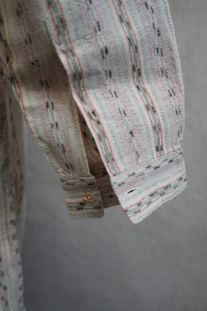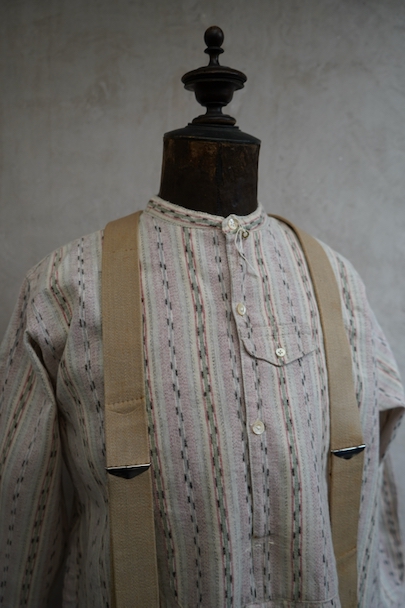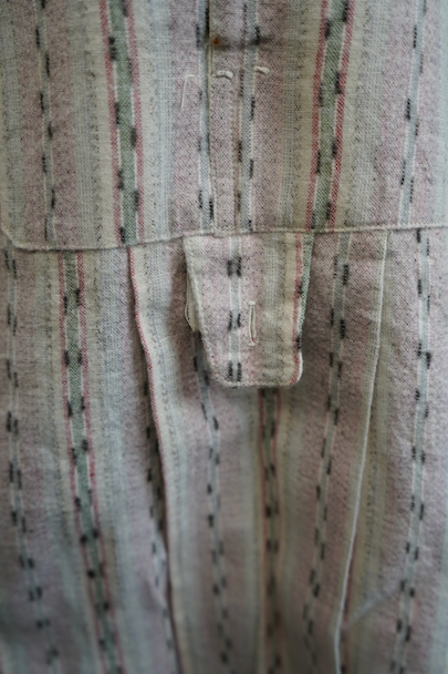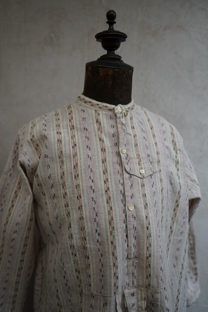 1930年代頃につくられたプルオーバー・シャツ。未使用品を一度洗濯しています。くすんだピンクとグリーンの凝ったストライプ柄のコットン素。少し起毛していますが、軽い布地です。ボタン留めになった小さなフラップポケットが左胸のサスペンダーを避ける位置についています。ボタンは薄いシェル・ボタン。左肩に薄いシミがあります。その他の状態は良いです。