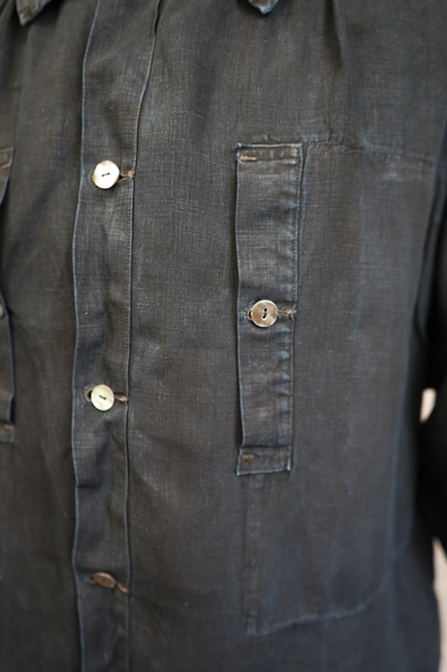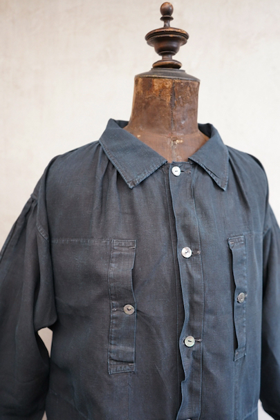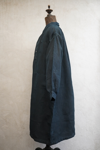 1930年代頃までにつくられたインディゴリネンのワークスモック。家畜の仲買人たちが着た仕事着です。ハリと滑らかさのある目が詰まったリネン地は動物の毛が付きにくく、はらいやすいように採用された実用的なもの。リネン地の良さはもちろん、深みのあるインディゴ染めが美しい品です。こちらはコートのように羽織れるフロントがフル・オープンするタイプです。ネック周りや袖口にはギャザーが入り、広い身幅の独特な形をしています。黒蝶貝の平たいボタン。元々男性がジャケットなどの上に汚れよけとして着用したものですが、女性にもお勧めです。両胸にボタン留めのポケット、中に着用した服のポケットに手が届くように左右のサイドには開きがあります。身幅等の採寸は自然に平置きした状態で計っています。小さな傷や多少のあたりはありますが、状態はとても良いです。