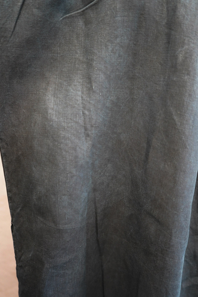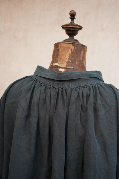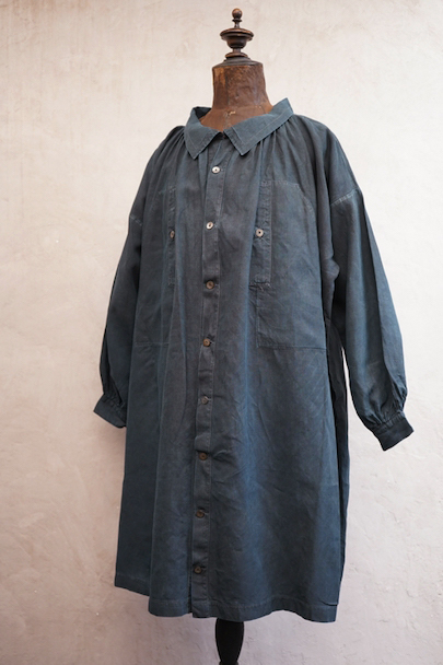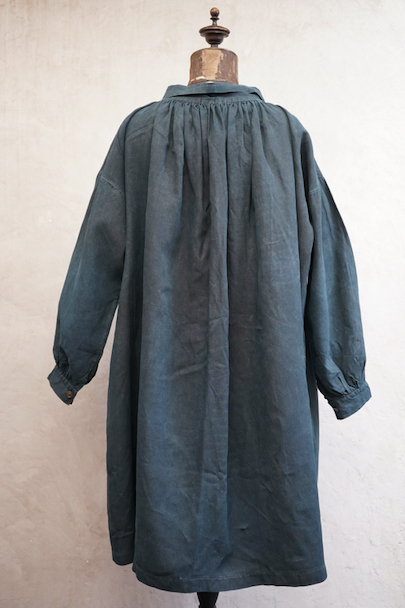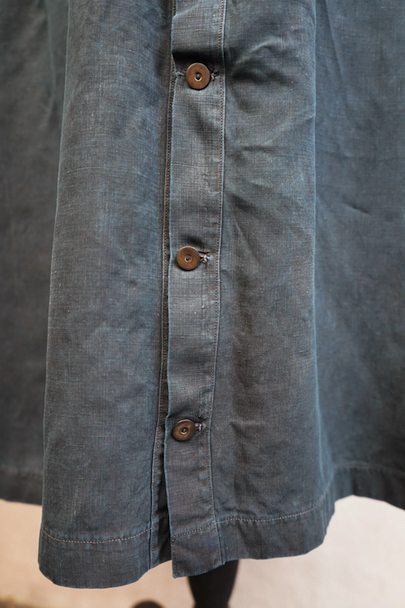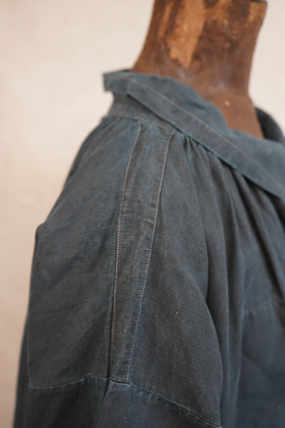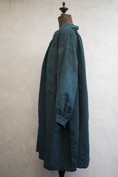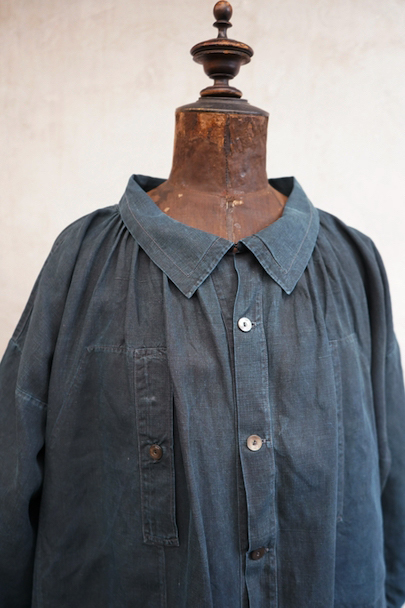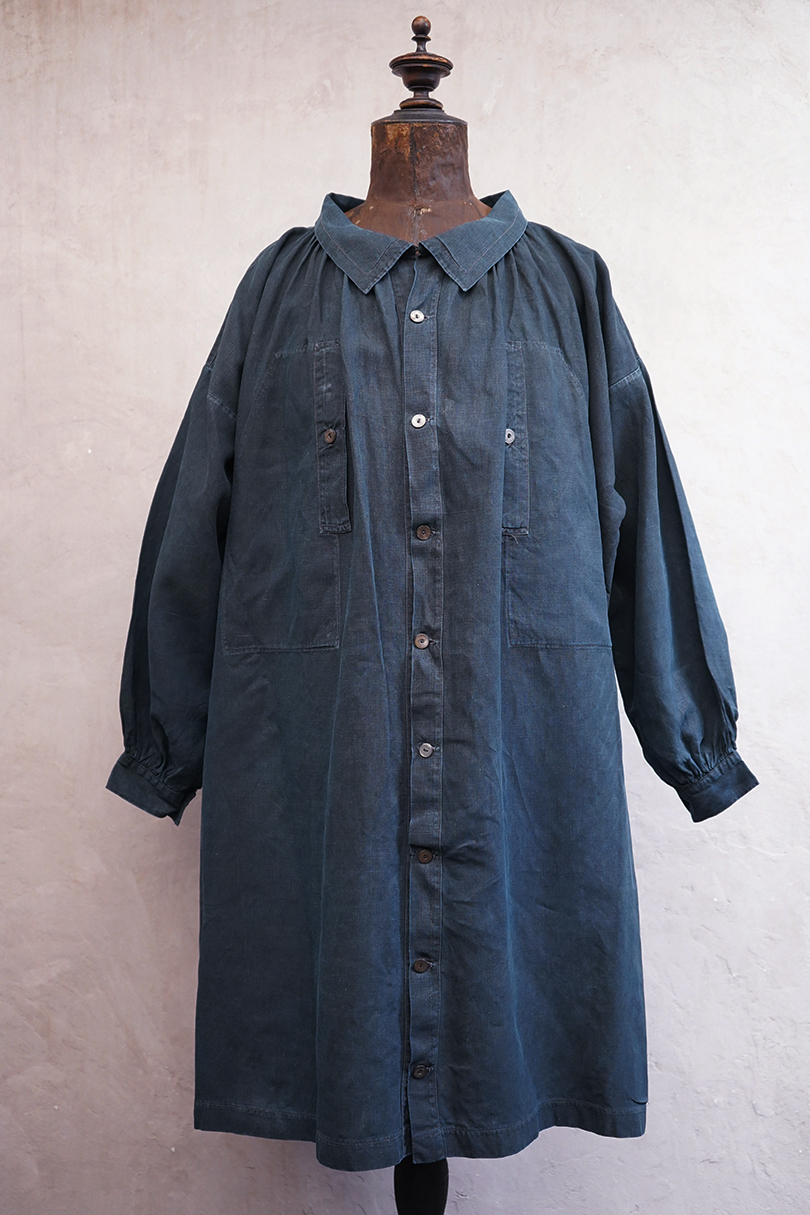 20世紀初期頃につくられたインディゴリネンのワークスモック。家畜の仲買人たちが着た仕事着です。ハリと滑らかさのある目が詰まったリネン地は動物の毛が付きにくく、はらいやすいように採用された実用的なもの。リネン地の良さはもちろん、深みのあるインディゴ染めが美しい品です。こちらはコートのように羽織れるフロントがフル・オープンするタイプです。ネック周りや袖口にはギャザーが入り、広い身幅の独特な形をしています。黒蝶貝のボタン、手縫いのボタンホール。元々男性がジャケットなどの上に汚れよけとして着用したものですが、女性にもお勧めです。両胸にボタン留めのポケット、中に着用した服のポケットに手が届くように左右のサイドには開きがあります。身幅等の採寸は自然に平置きした状態で計っています。左袖に3cm強の直し痕、多少の色むらはありますが、大きなダメージはなく状態は良いです。