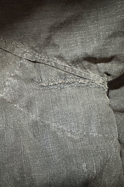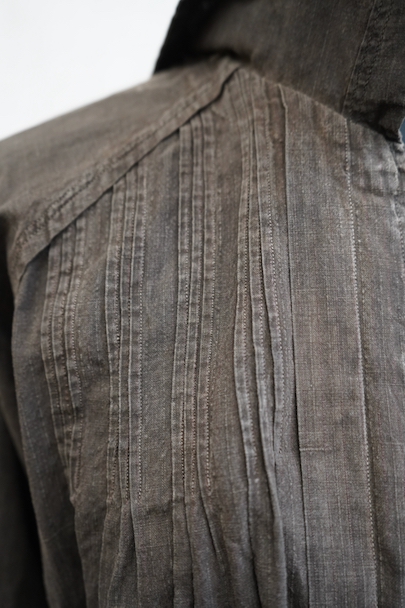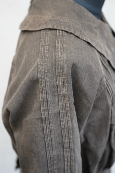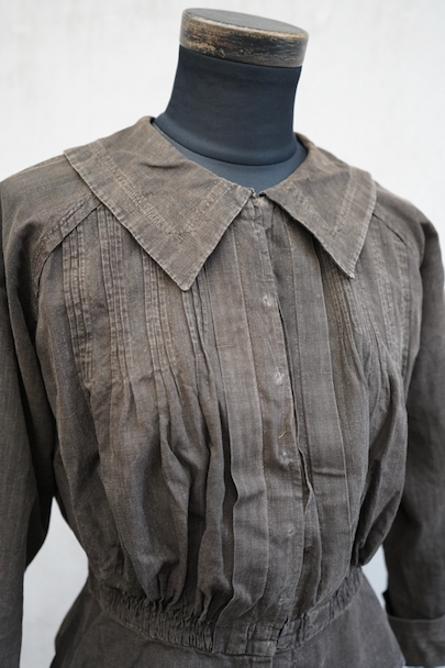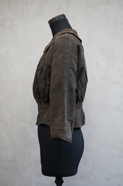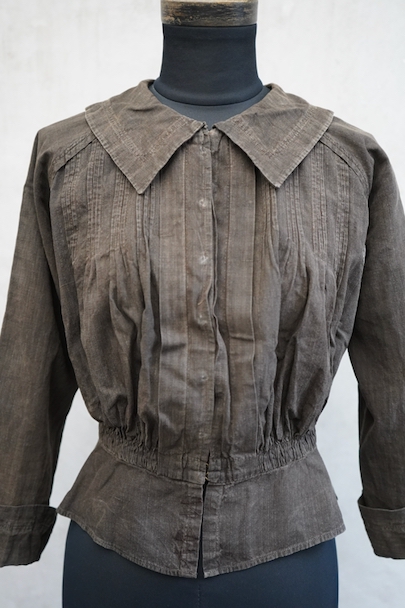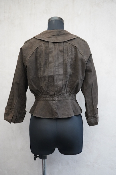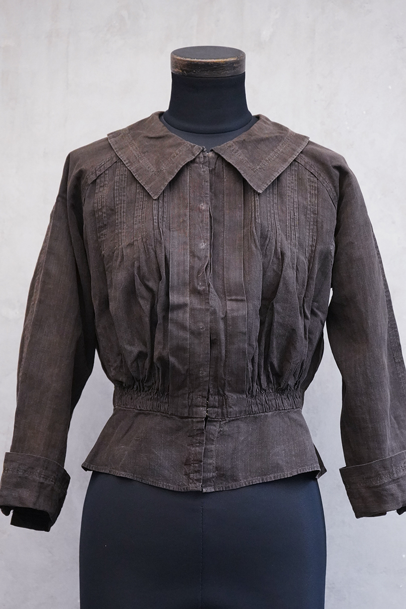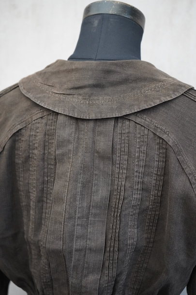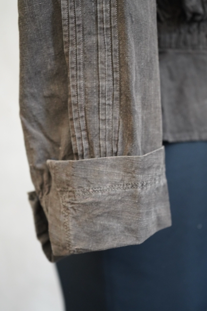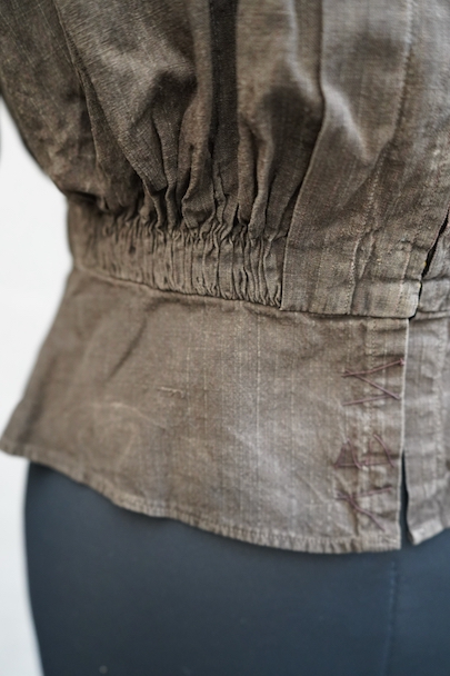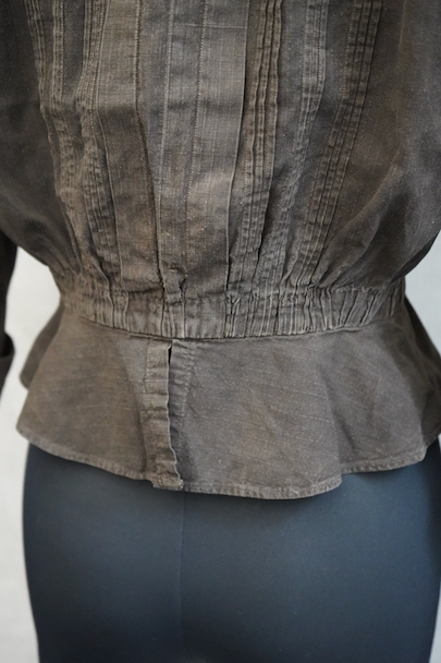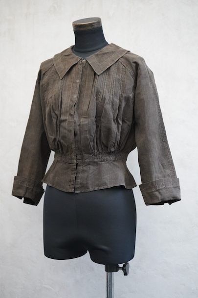 20世紀初期頃につくられた七分袖のブラウン・リネン・ブラウス。深みのある良い色の薄手で目の詰まった布地です。ピンタックやギャザー使いも美しいです。肩はラグランで、サイズ感はSから細身のMくらいです。フロントはスナップボタン留め。左脇下に8cmの手縫いの直し痕、フロント下のホックが1つ無くなっています。
