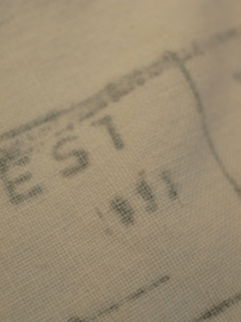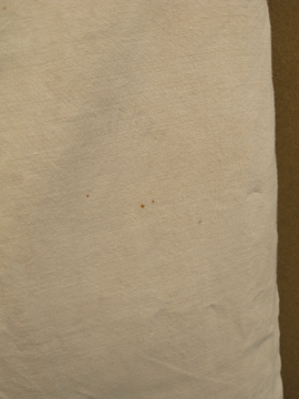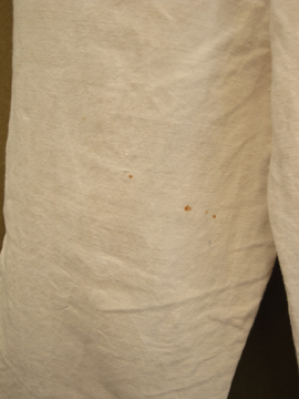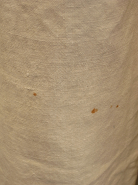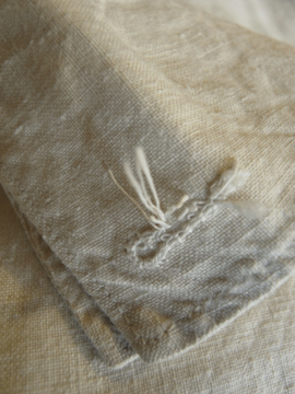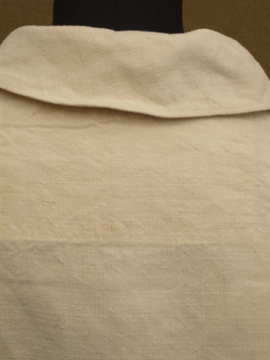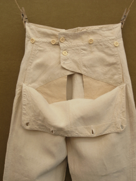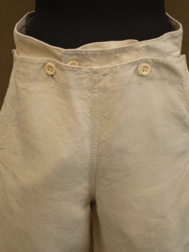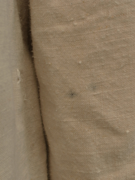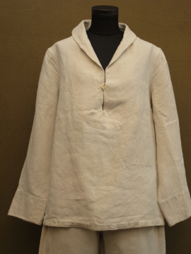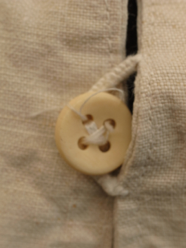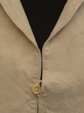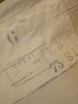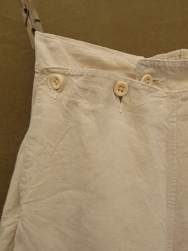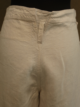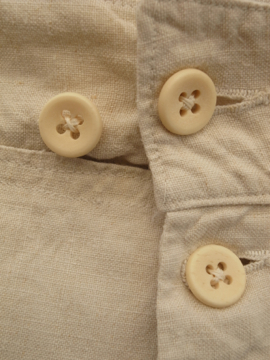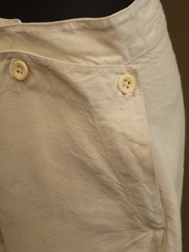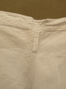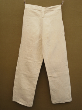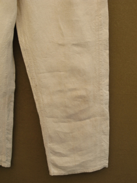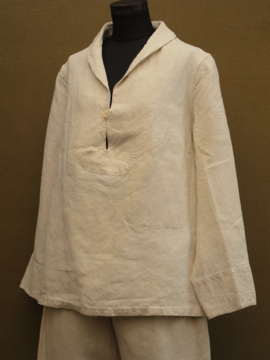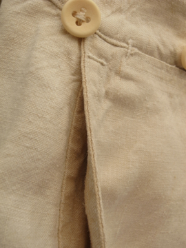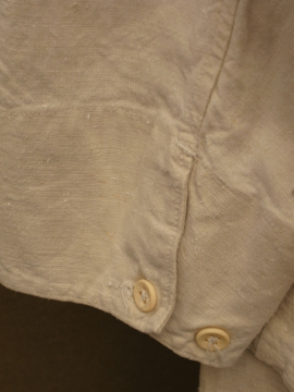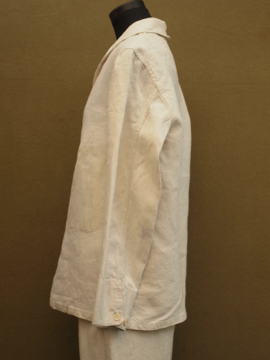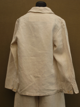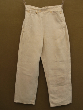 1930年代頃につくられたショールカラーのセーラー・セットアップ。目が詰まったリネン素材は程よいハリと柔らかさを併せ持つ良い質感です。上下共に多少のシミや汚れなど経年の傷みがありますが比較的きれいで、穴等は無く布地がしっかりとしています。ボタンは全てボーン製。トップス右袖口のボタンホールが未完成です。パンツのフロント部分のボタンをウエストサイズが小さくなるように付け替えられていますが、本来の位置に戻すとウエスト周り80cmくらいになります。サイズが小さめなので女性にもおすすめです。状態は良いです。