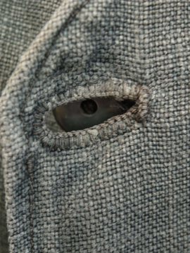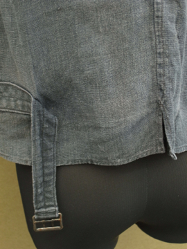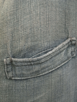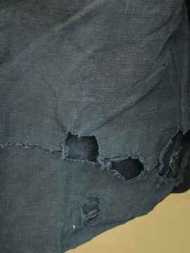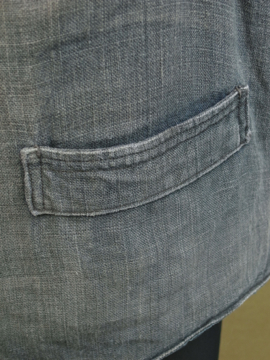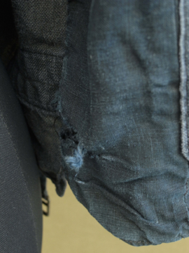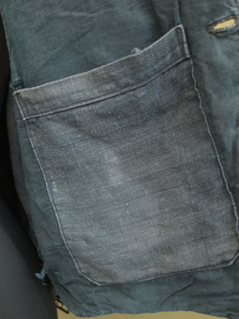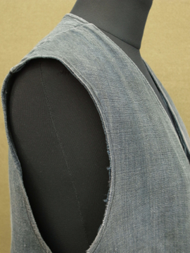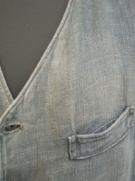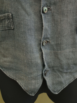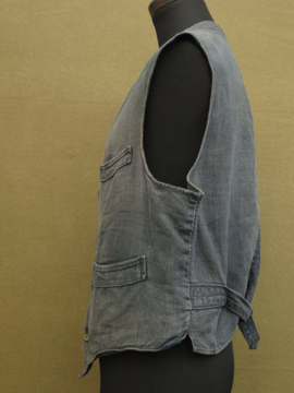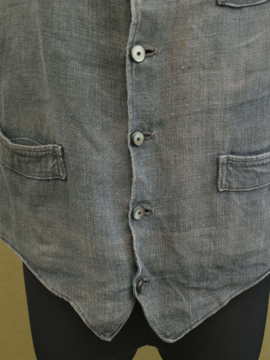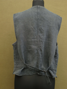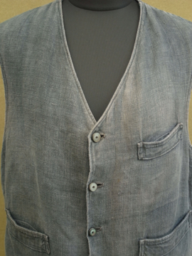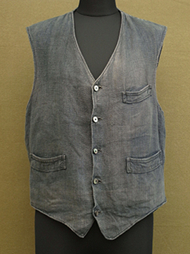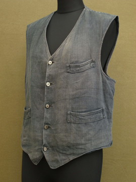 1920年から1930年代頃につくられたインディゴ染めリネン・ジレ。前後身頃が同素材のフェードしたインディゴ染めリネン、良い風合いがあります。厚みのある黒い貝ボタンが布地に良く合っています。ボタンホールは手縫い。フロントに3つのポケット、内ポケットもついています。表地は退色による色むら、若干のシミが見られますが大きな穴等のダメージはありません。裏地に破れや脇部分に擦れが見られます。バックについたストラップで身幅のサイズ調節ができます。とても味のある品です。