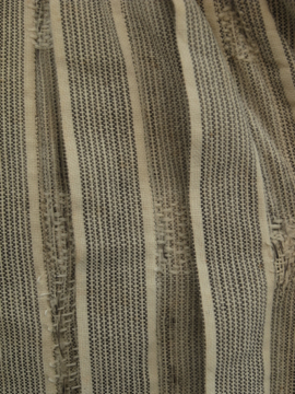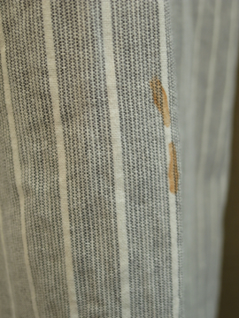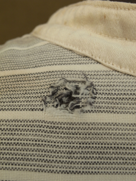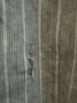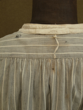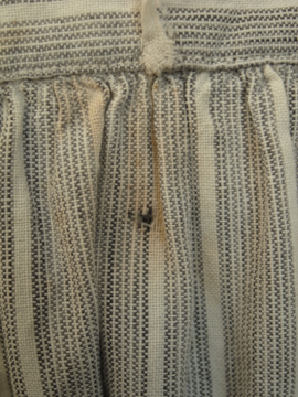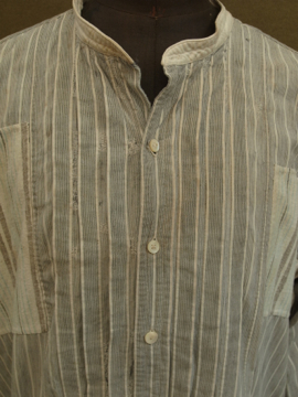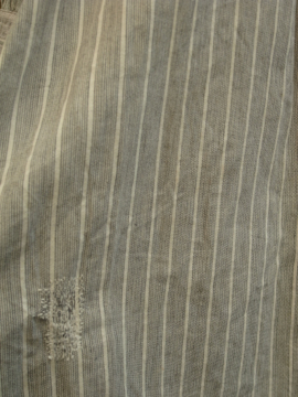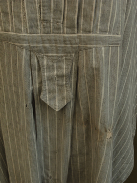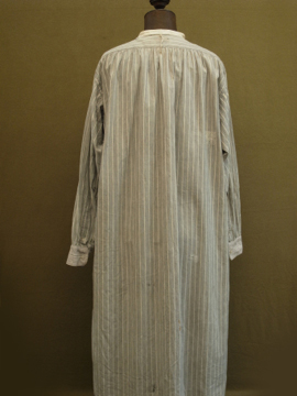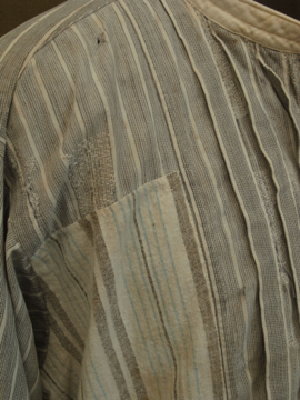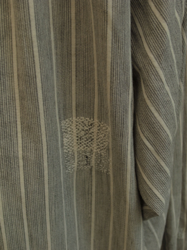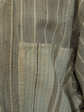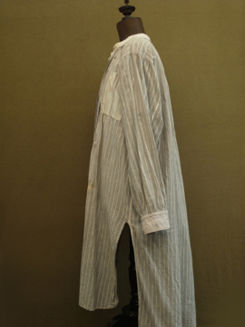 1930年代頃までにつくられたロングシャツ。ストライプ織り柄のコットン素材、プルオーバータイプです。全体的に当て布や細かく縫われた直しが多数あり、大事に直しながら長く着られたことがわかります。非常に魅力的な様子になっていますが、酷使された生地は弱くなっています。シミや穴も多数あるので、ダメージを気にされない方や直しながらご愛用いただける方にお勧めいたします。