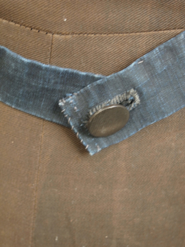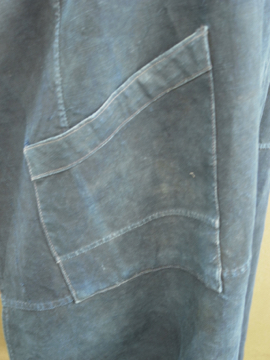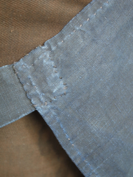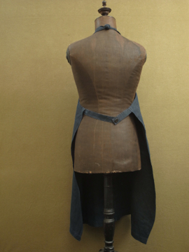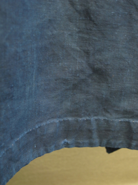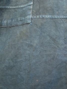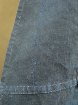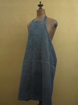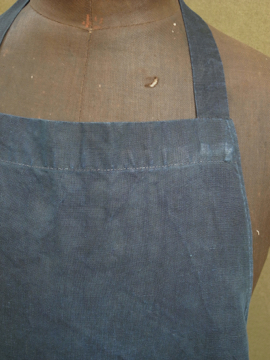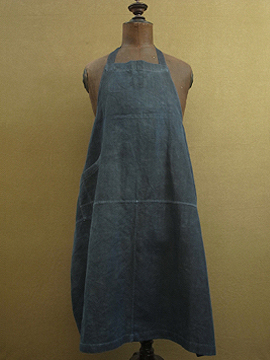 20世紀初期頃につくられたインディゴ染めリネンのエプロン。目の詰まったハリと柔らかさのあるとても良いリネン地は、家畜の仲買人や羊飼いらが着たインディゴ染めリネン・スモックと同じ素材です。フロント右にポケット付き。全体的に多少の汚れや色ムラ、スレや小さな穴など、経年の傷みがありますが良い風合いです。