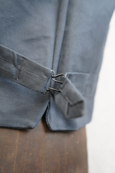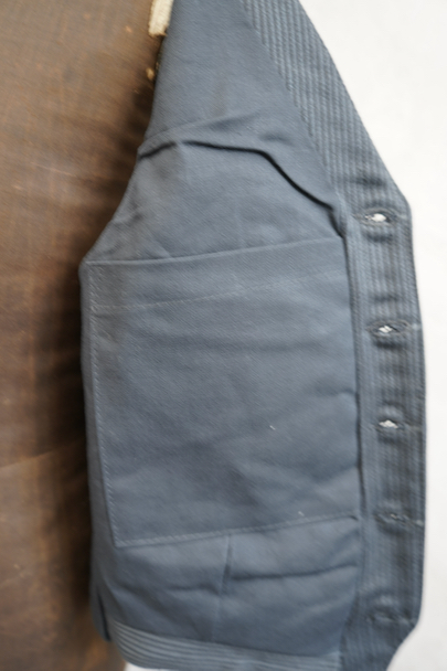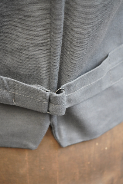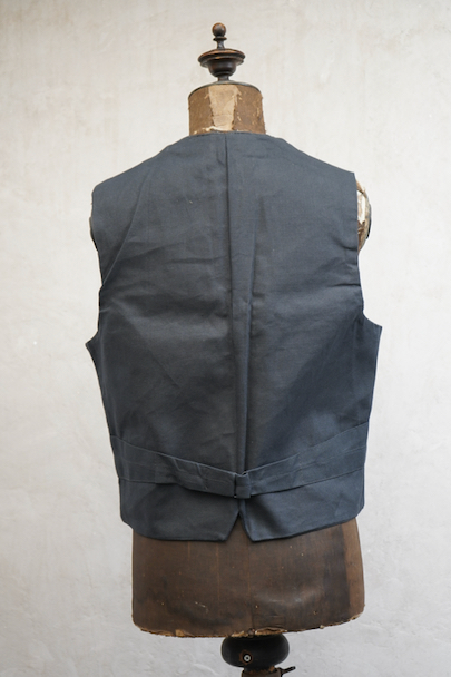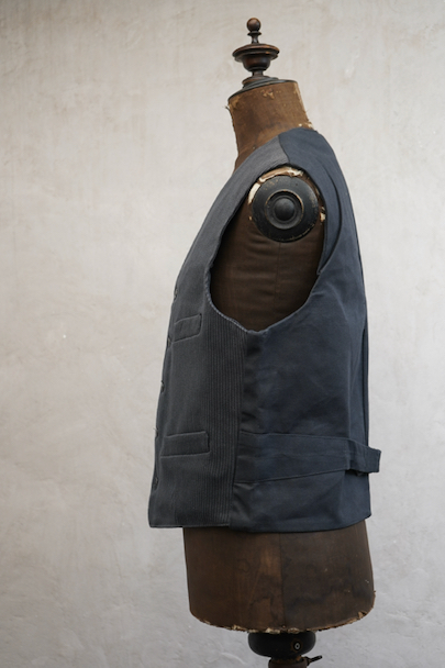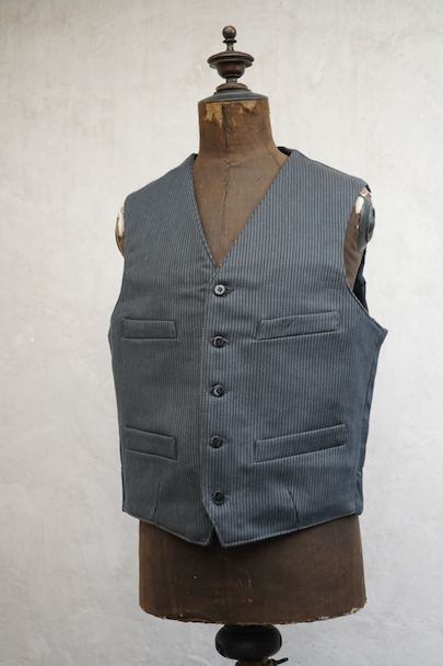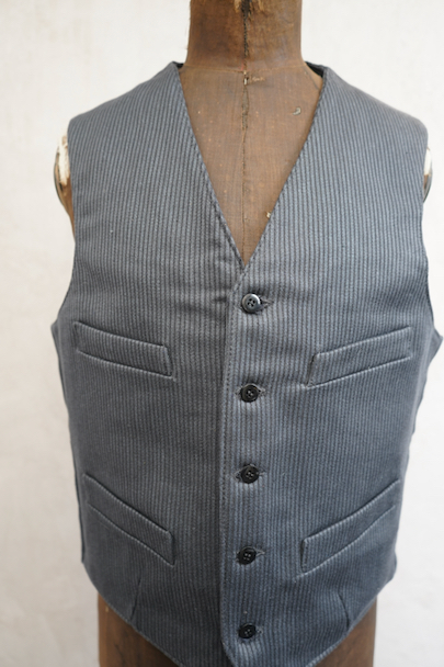 20世紀中期頃につくられたワークジレ。デッドストックです。フロントはグレーのコットン・ピケ素材、地の色と畝と色が違うのでストライプになっています。バックと裏地は黒い布地です。フロントに4つのポケット、内ポケットが1つ。バックチンチで身幅のサイズ調節が可能です。保管中の傷みはなく状態はとても良いです。