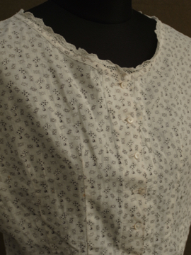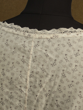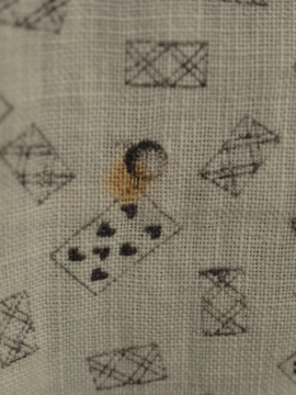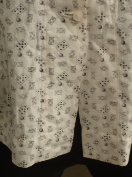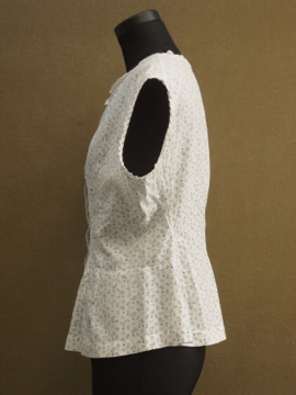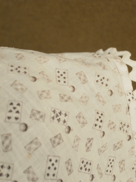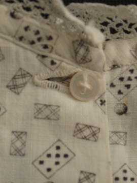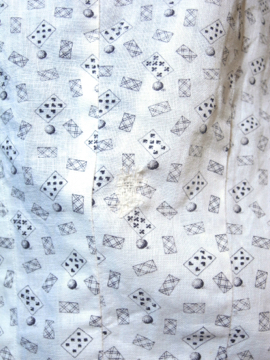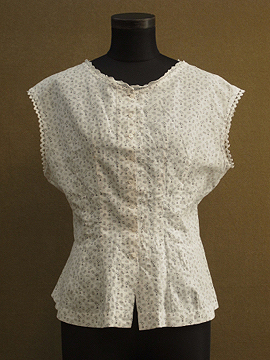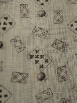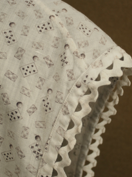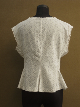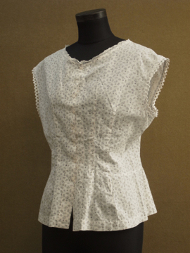 19世紀後期から20世紀初期頃につくられたスリーブレス・トップ。薄手のコットン素材にトランプ柄がプリントされた珍しい布地です。コルセットを着用した時代の品で、ウエストラインがシェイプされ裾に向かって広がるシルエットがとても綺麗です。手縫いとミシン縫いの両方で丁寧に作られています。小さな貝ボタンが可愛らしいです。肩幅の表記が大きく感じるかもしれませんが、肩の落ちるつくりで大人女性のMサイズくらいです。フロント中央に1.5cm程の直し痕、全体的に小さな汚れや色焼けがあります。ダメージを気にされない方、古いものが好きな方にお勧めです。