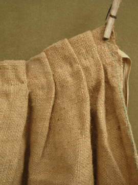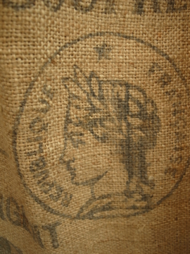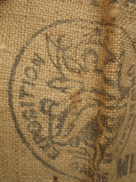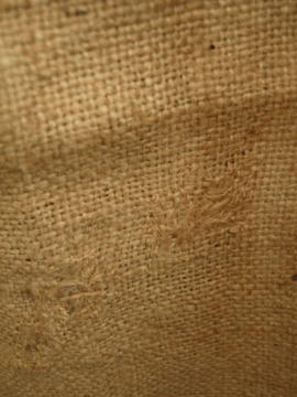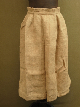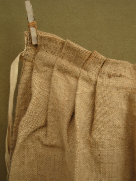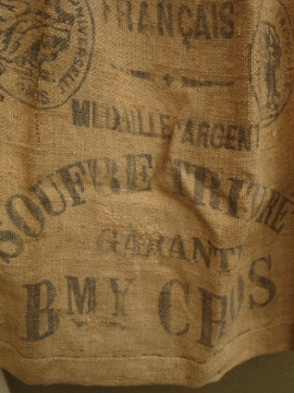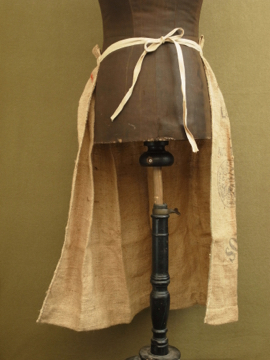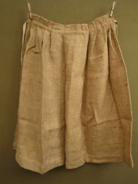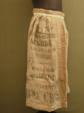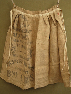 ジュートのサックを裂いて作られたエプロン。全て手縫いで作られており、20世紀初期頃のものだと思います。紐部分はストライプ織りのコットン素材です。目の粗さや手縫いの直し痕が素朴で良いです。おそらく未使用品ですが、埃っぽいです。洗濯はしておりません。