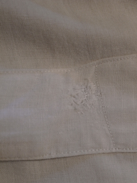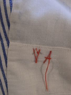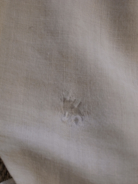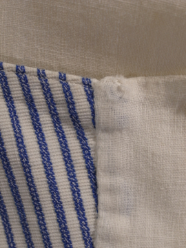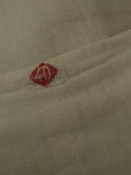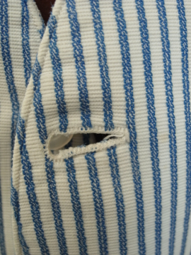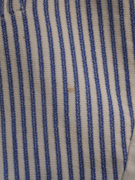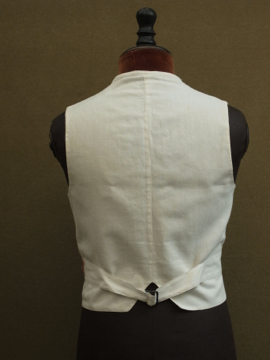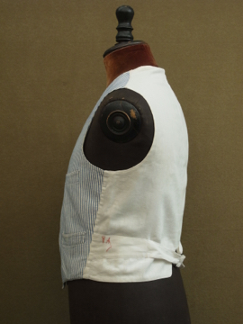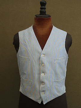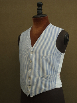 1930年から1940年代頃につくられたジレ。前身頃は白地にインディゴ・ストライプ織り柄が美しいコットン地です。ボタンはシェル製、ボタンホールは手縫い。バックについたストラップで多少のサイズ調節ができます。小さいシミ、ネックラインやアームホールなどに擦れ、バック・ストラップに直し痕、裏地に1cm角ほどの穴があります。全体的な状態は比較的良いです。表記サイズは40、男性Sサイズくらいです。