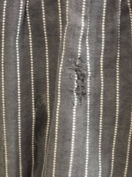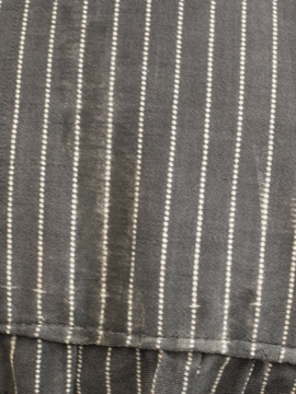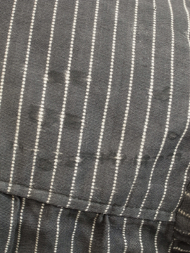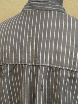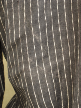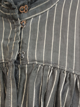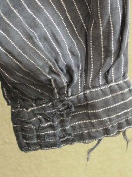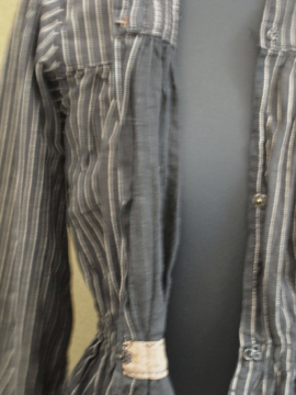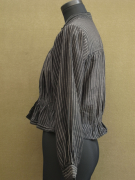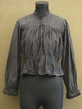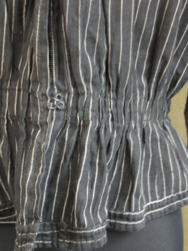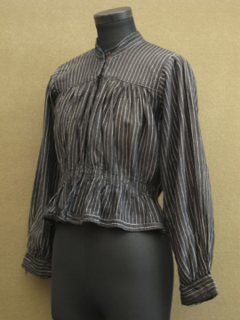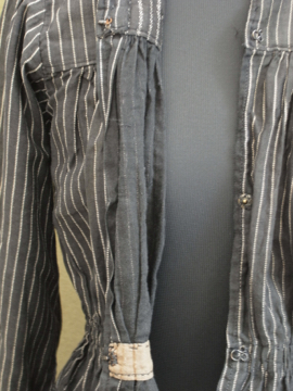20世紀初期頃につくられたコットンブラウス。コットンツイルの黒い布地をドットのストライプに抜染した良い布地が使用されています。短い着丈が印象的なコルセットを使用した時代の品。フロント切り替え下やウエスト周りに入ったギャザーで布に動きが出でシルエットが綺麗です。全体的に大小の穴、擦れ、ほつれ、直し痕などかなりの傷みがあります。直しながら着用できる方、傷みみを気にされない方向きです。