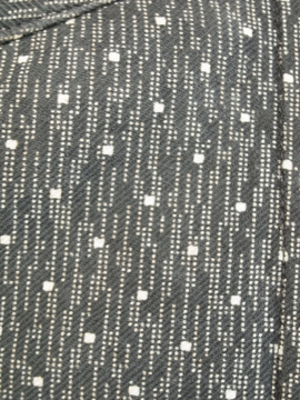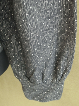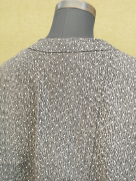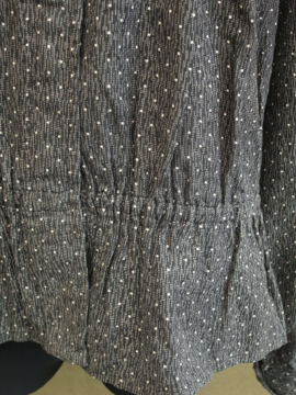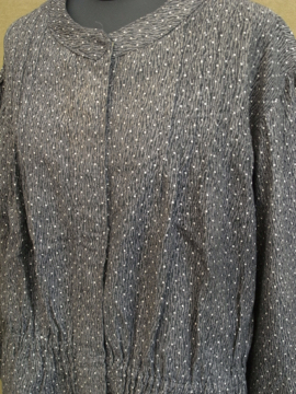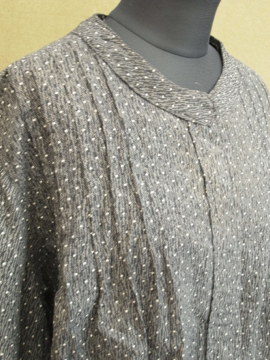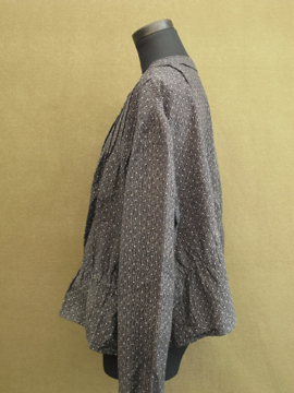 1930年代頃までにつくられたブラウス。細かい柄のプリントされたコットン素材。両肩からプリーツが入りウエスト部分で少し絞られたデザイン、カフ部分にギャザー、全体的に布が多く使われています。フロントと袖口はスナップボタン留め。全体的に黄ばみや色むらがあります。このようなタイプのブラウスでは珍しい大きめのサイズです。ほとんど使用感はなく、状態は良いです。