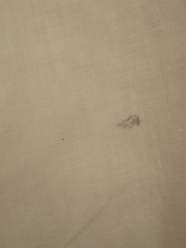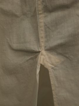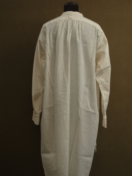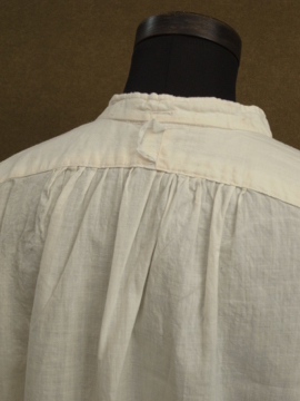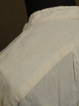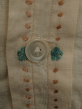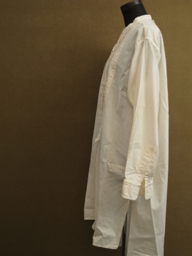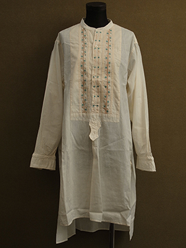 1920年から1930年代頃につくられたドレスシャツ。クリーム色のコットン素材、胸当てに青や茶色のシルク糸で刺繍が施された珍しいものです。胸当てにはピンタックも入っています。袖口はカフリンクスで留める仕様です(ボタンを縫い付けてもよいと思います)。0.1cmから1cmほどのシミがいくつかありますが、大きな傷みはなく年代にしては状態は良いです。