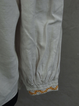 20世紀初期頃につくられた東欧のフォーク・トップ。リネン素材です。ネック周りと肩、袖口にとても細かいギャザーが入った美しい品です。ボタンはガラス製。部分的に施された白と黄色の手刺繍も目を惹きます。ネック周りに擦れ、内側の着用時に見えない部分に穴があります。その他、フロント中央下に薄く黒い染み、左裾近くに1cmの直し痕、ほつれ、擦れなどの経年の傷みがあります。ネック周りが33cmと細いですが、ボタンを留めなければ着用できます。サイズはMくらいです。
