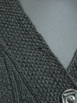 1930年代頃までにつくられたウールニットカーディガン。少しリネンが混ざったような質感で、綺麗な編み目の良い品です。穴が多数、手縫いの直し痕や擦れ、糸のほつれなど経年の傷みがありますが、珍しい品なのでダメージを気にされない方や直しながらご着用いただける方にお勧めです。サイズは女性のMからLサイズくらいです。
