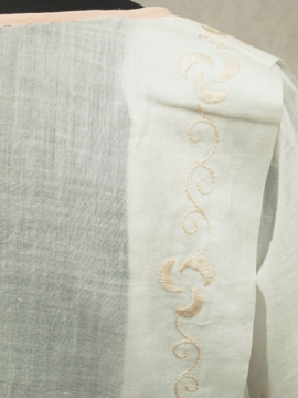 1920年代から1930年代頃につくられた半袖トップ。薄手でとても柔らかい質感のコットン素材にクリーム色で淡いシルクの手刺繍が施されています。袖口部分は後の時代に直されているようで、この部分のみミシン縫いで少し粗い縫い目ですが、その他は手縫いで丁寧な良いつくりです。ネックまわりに小さめの穴が数か所、その他小さな薄いシミなど経年の傷みがありますが、比較的状態は良いと思います。繊細な品ですので、古い品に理解のある方にお勧めします。