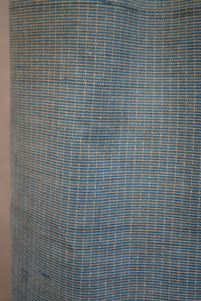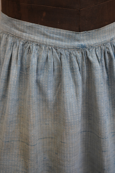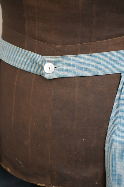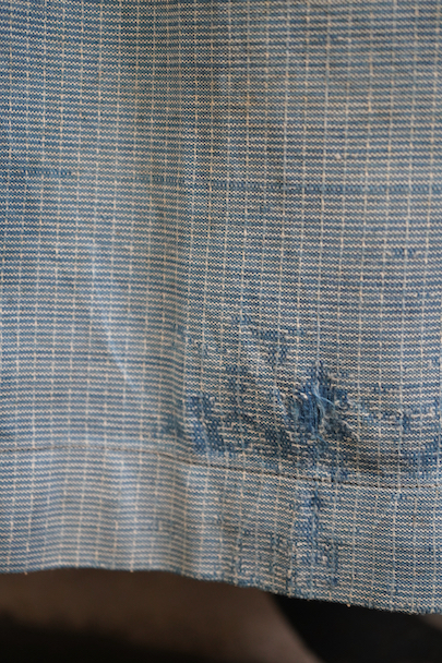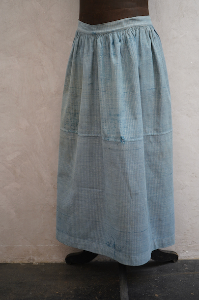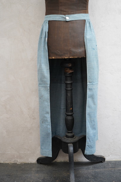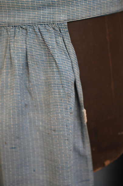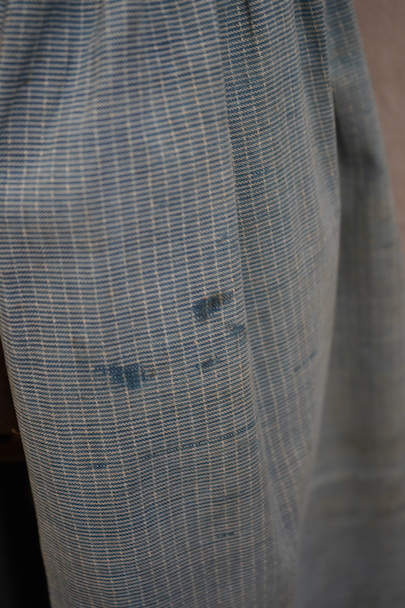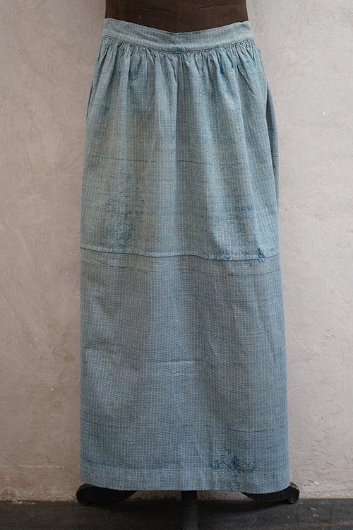 20世紀初期頃につくられたエプロン。細かいチェック柄に織られた風合いの良いインディゴ・コットン素材です。ウエスト周りに細かいギャザーが入っています。布地は中央あたりで継がれています。穴やシミ、擦れなどの経年の痛みがあります。 とても珍しい布地です。