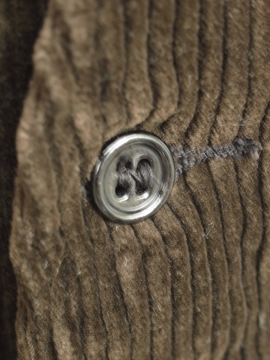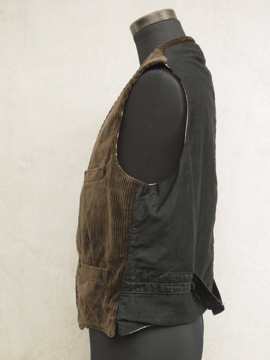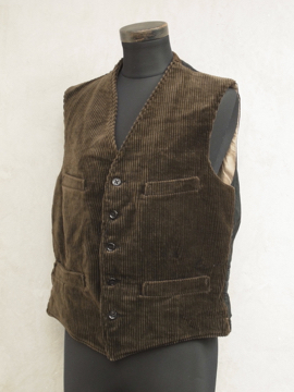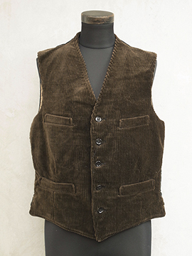 1940年代頃につくられたコーデュロイ・ジレ/ベスト。柔らかい質感の太畝コーデュロイ生地に黒塗りのメタルボタンが使用された良い品です。フロントに4個のポケット、シンチバックでウエストまわりのサイズ調節ができます。裏地に若干の汚れがありますが、表地の状態は良いです。小さめのサイズ感なので、ワークウェア好きの女性にお勧めです。