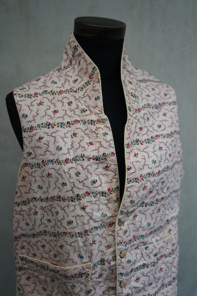 19世紀につくられたジレ。フロントは薄いピンクに花モチーフのプリントの美しい布地です。共布の包みボタンがついています。スタンドカラー、左右にポケット、バックはレースアップで締める古い仕様です(紐は無いです)。目立ったダメージはなく、年代を考えると非常に良い状態です。小さめで女性にお勧めです。