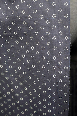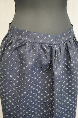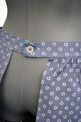 20世紀初期頃につくられたインディゴリネンエプロン。未使用品で状態が良いです。目の詰まったリネン地は糊が付いているため張りがあります。深いインディゴ染めが綺麗で、小花柄が可愛らしいです。裏にするとストライプ柄として楽しむこともできます。サイドに糸が出ている部分があります。使い込んでいくと柔らかさと滑らかさが出てきます。