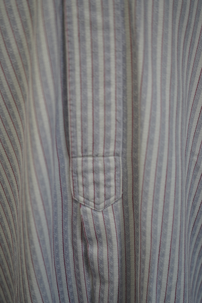 1940年代頃までにつくられたプルオーバー・シャツ。薄いブルーと白に細い赤いラインが入ったストライプ柄のコットン素材です。薄いブルーの部分には織り柄も入った綺麗な布地です。トップはボタンがなく開いた形です。ガラスボタン、ボタンホールは手縫い。襟内側や袖口に擦れた傷、バック左肩部分に5mmの穴、その他多少のほつれや小さなシミがあります。