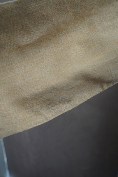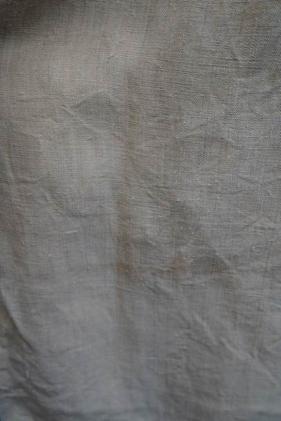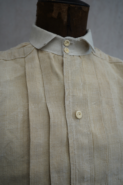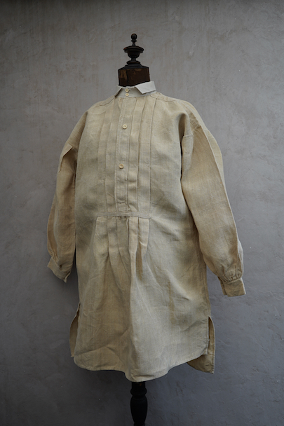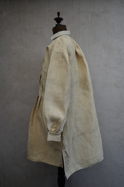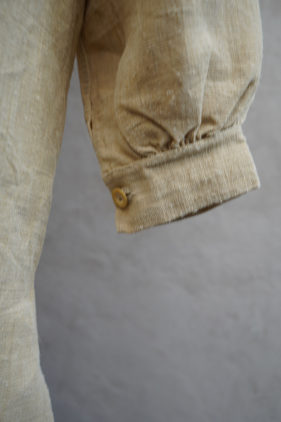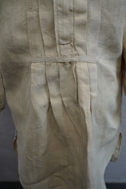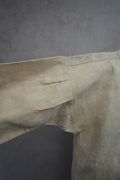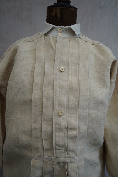 20世紀初期頃につくられたヘンプ・シャツ。厚手で硬さのあるヘンプ生地、ツルっとした質感がある良い布地です。襟部分はリネン地です。袖口やネック周りバックに細かいギャザー、肩についたY字のヨーク、胸のプリーツ、手縫いのボタンホール、ボーン・ボタン、フロントトップがダブルボタンで襟高の仕様など良いディテールです。生地にネップがあります。バックに色むら(薄いシミ)があります。状態は良いです。