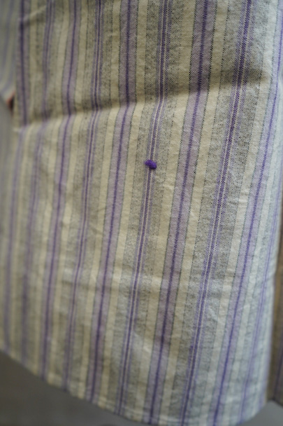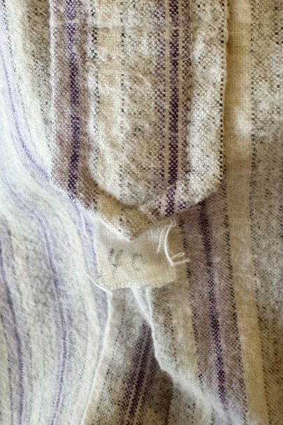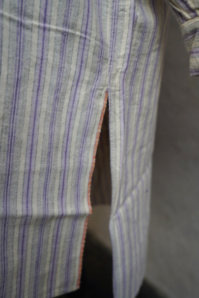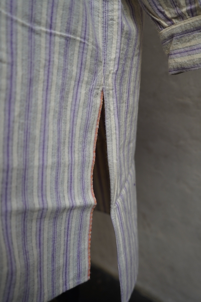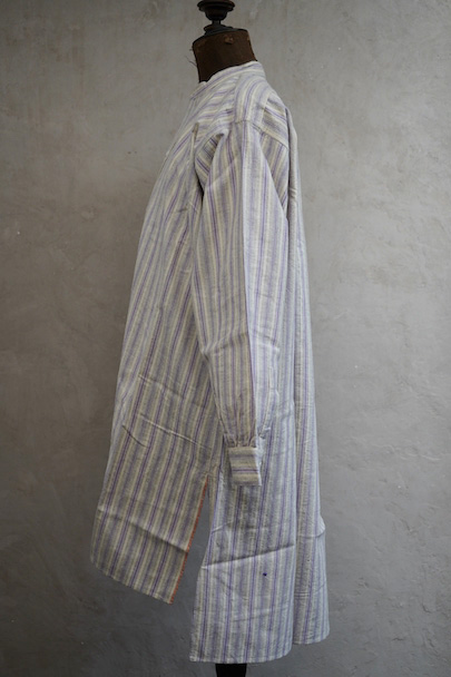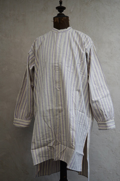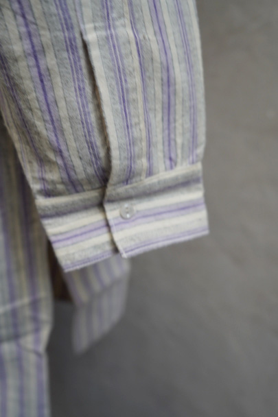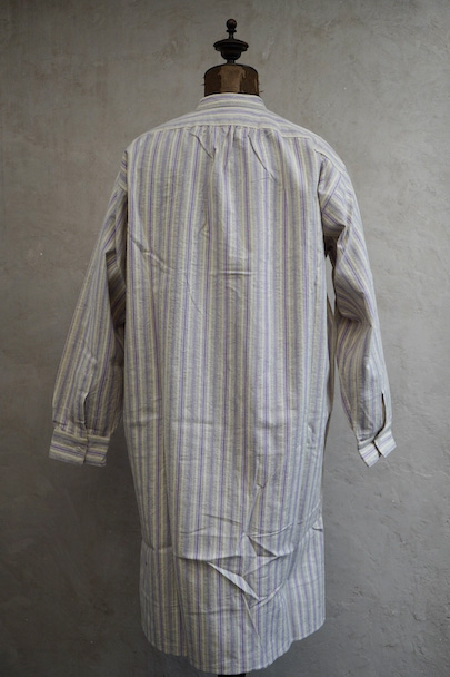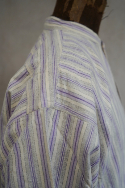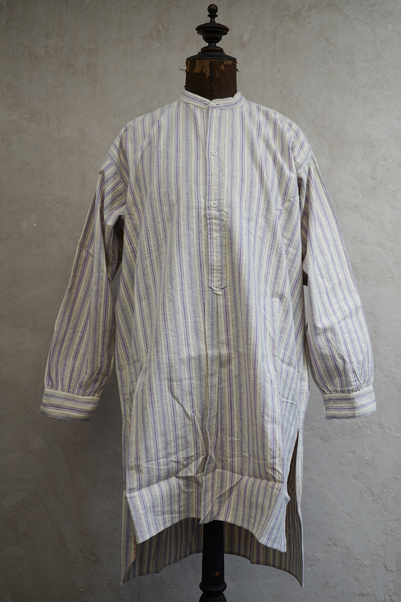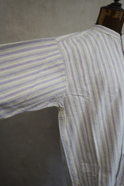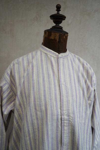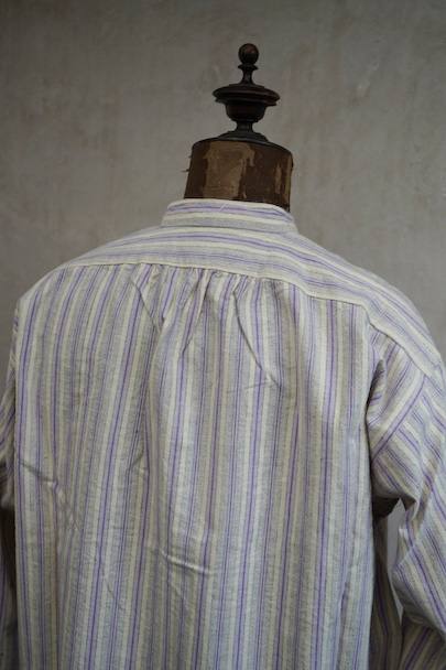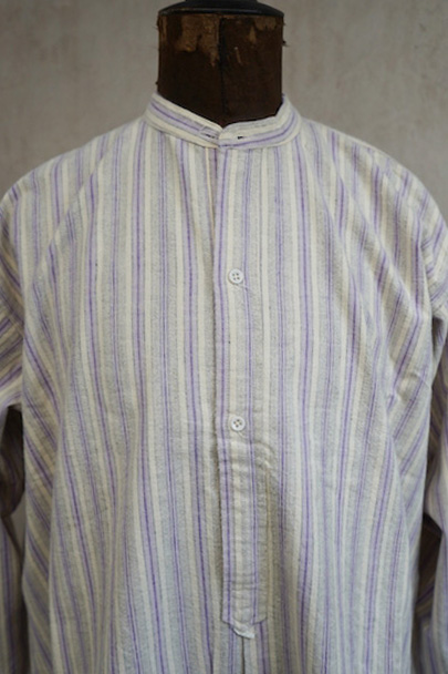 1940年代頃までにつくられたシャツ。未使用品を一度洗濯しています。パープル系とグレーのストライプ織り柄の入ったオフホワイトのコットン素材、起毛した布地です。フロントのトップはスタッズで襟と留める仕様、その下は2つボタン留めのプルオーバー・タイプです。バックのヨーク下とカフ部分にギャザーが入っています。ボタンはガラス製。生地にネップが見られます。表記サイズは40。状態はとても良いです。