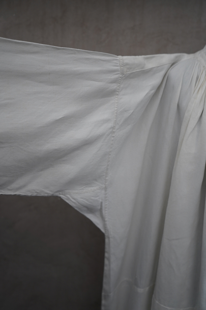 1930年代頃までにつくられた教会用のロング・スモック。リネン素材です。袖口や裾に手刺繍が施されたテープが手縫いで縫い付けられています。ネック周りには細かいギャザーが入り、布地をたっぷり使用しています。全体的に若干の黄ばみがありますが、状態は良いです。