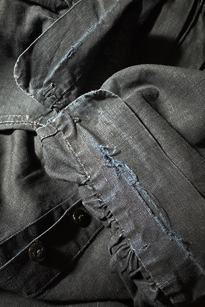20世紀初期頃につくられたインディゴ染めリネン・スモック。主に家畜商などが汚れよけのために着用したワークウェア。襟のないプルオーバータイプ、大きく開き4つのボタンとトップはホックで留める仕様、少し変わったデザインです。比較的しっかりとした目の詰まったリネン地はハリと柔らかさを感じさせる良い質感です。ネックまわりや袖口に細かいギャザー、手縫いの素朴なボタンホールにガラスボタン。ウエスト左右に中にアクセスするスラッシュがあります。 カフ部分を折り返して着用していたのか、内側に擦り切れがあります。小さな直し痕がありますが、その他の状態は良いです。