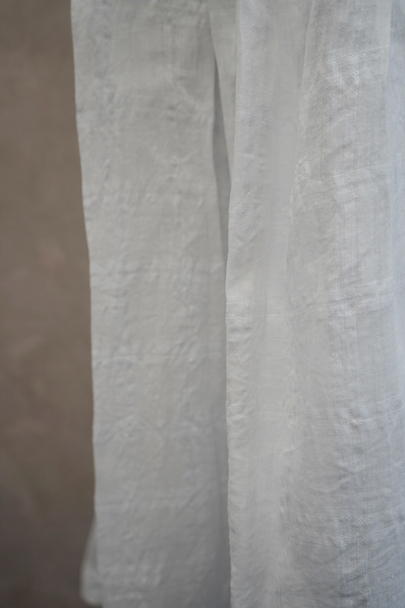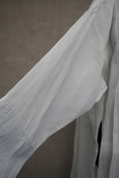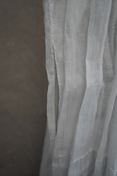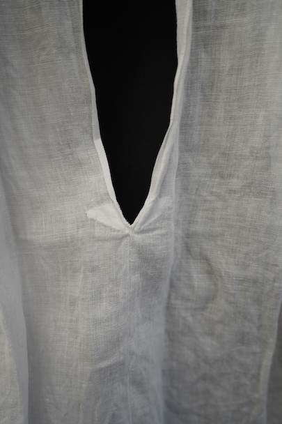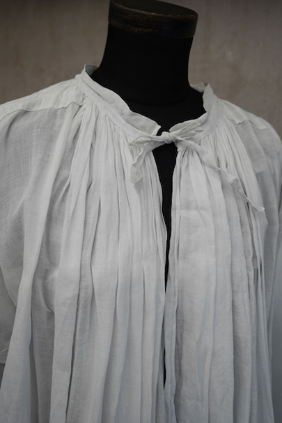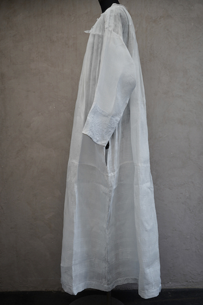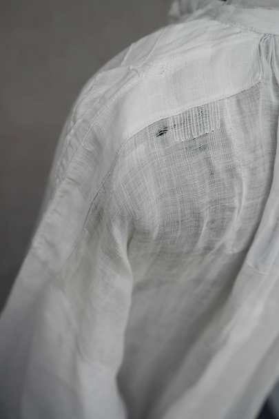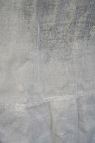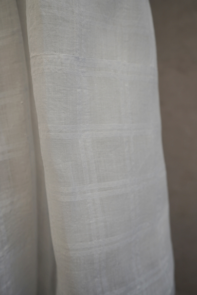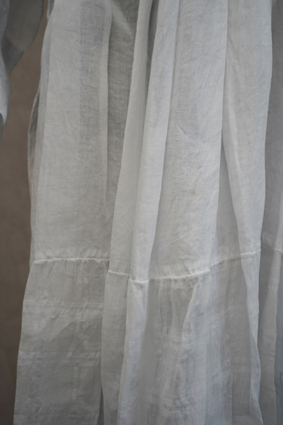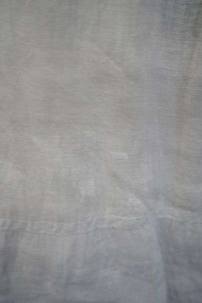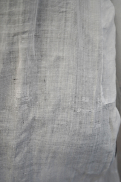 20世紀初期頃までにつくられた教会用のロング・スモック。薄手のリネン地ですが、糊が効いているためかなりハリがあります。ウエスト切り替え下からチェック織りのリネン地が使用されているのが珍しいです。ネック周りには細かいギャザーが入り布地をたっぷりと使用していますが、薄手でリネン素材なので重たい感じは無く良い風合いです。フロント紐下は38cm開いています。左右サイドには30cm程の開きがあります。全体的に大小の手縫いの直しが施されていますが、刺繍のように綺麗で丁寧な直しです。その他パッチワーク、小さな染みや小さな穴が多数あるなど経年の傷みがあります。ダメージを気にされない方にお勧めです。元々男性が着用したものなので、男性もどうぞ。