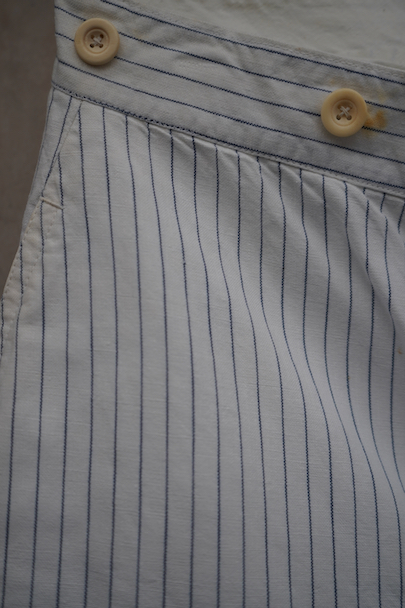 1930年代頃までにつくられたジレとパンツのセット。白地にネイビーの細いストライプ織り柄のコットン素材です。ジレはネックラインバックにピンホール、所々薄いシミがある程度で、大きなダメージはなく状態は良いです。パンツは後ろが高くなったウエストラインにサスペンダー用ボタン、バックシンチ、フロントはボタンフライ。ポケットはステッチ入り。裾はダブルです。フロントのホックに錆があり、周辺をにサビ染みが多くあります。右腿裏などに細かいシミ、全体的に薄い黄ばみが見られます。ジレのボタンは樹脂製、パンツのボタンはボーン製です。