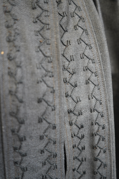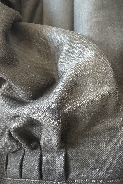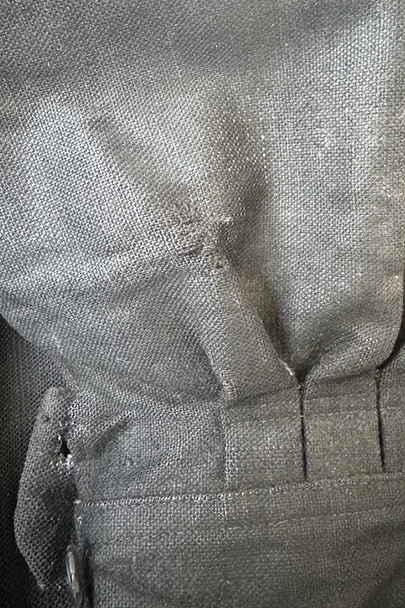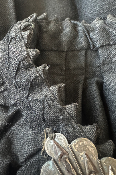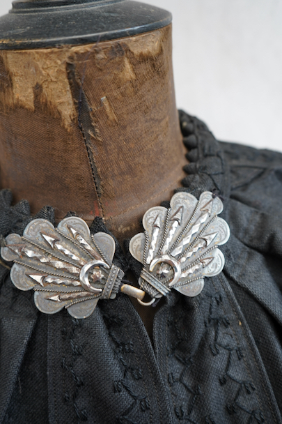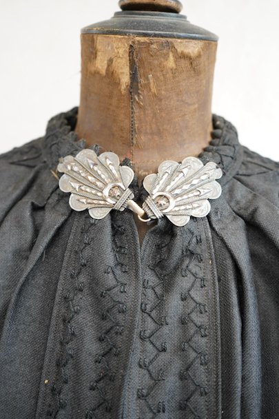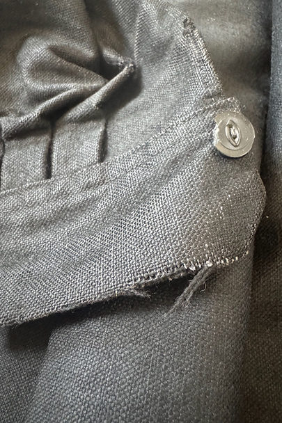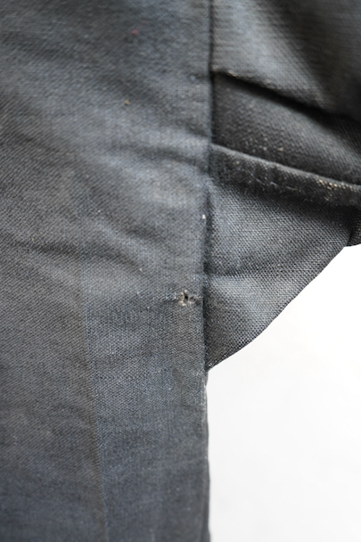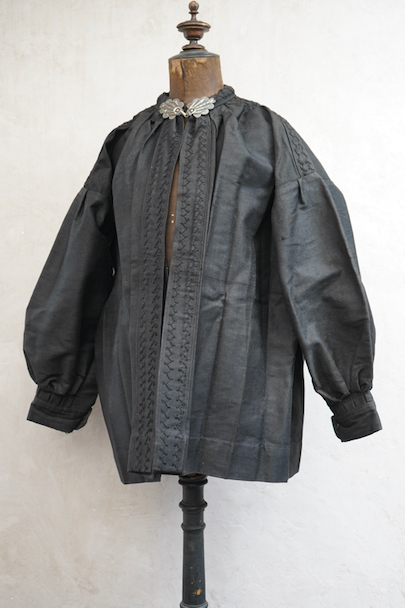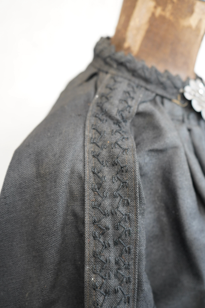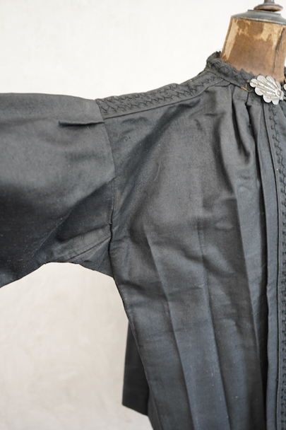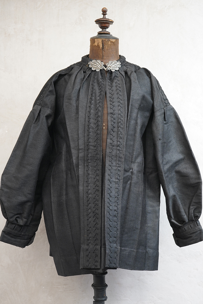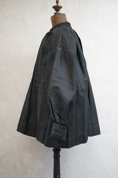 ネック周りやカフ部分にプリーツが入り、ショート丈でボリュームのあるシルエットのスモック/ジャケット。20世紀初期頃までにつくられたものだと思います。真っ黒に見えますがインディゴ染めのウール・ヘンプ素材です。フロント・トップを装飾の美しい大きなホックで留める仕様、その下はボタンなどはなく開いています。ギザギザにデザインされた首周り、前立て、肩のヨークは手刺繍で装飾されています。右袖口に擦り切れ、両袖口近くに擦れた傷み、その他、袖口のボタンに欠け、小穴や多少のほつれや汚れなどがあります。全体的に使用感は少なく、年代と素材を考えると状態は良いです。プリーツが入っていますが、伸ばさず平置きで採寸しています。