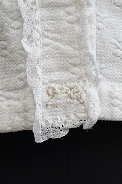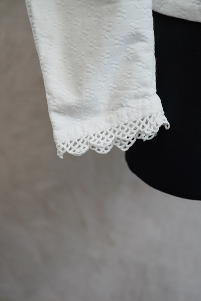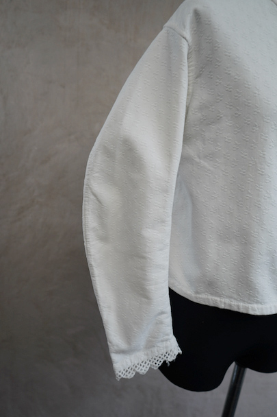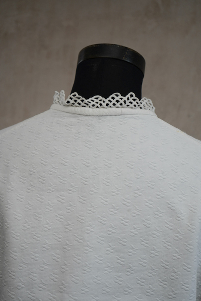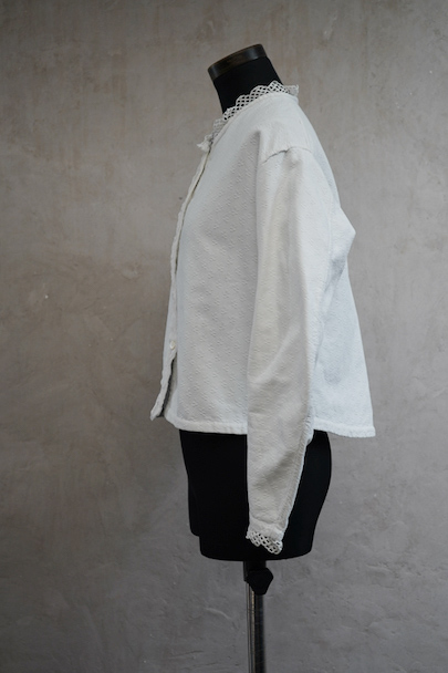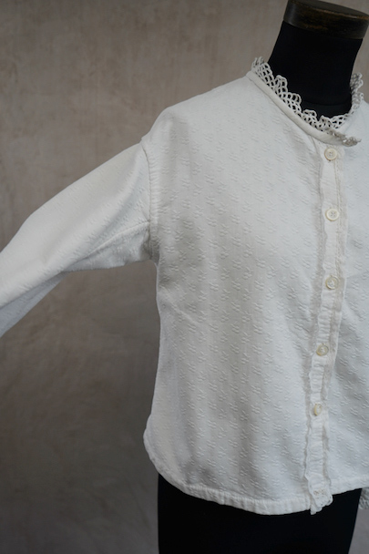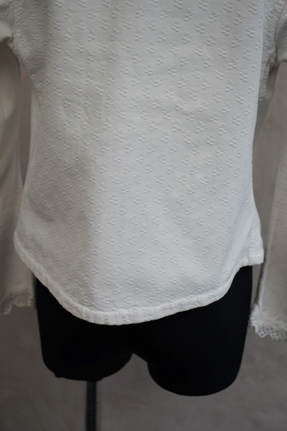 20世紀初期頃までにつくられたブラウス。裏起毛で中厚手のコットン素材、浮き模様が綺麗なあたたかい品です。手縫いで丁寧なつくり、シェルボタンや前にカーブした袖のラインが綺麗です。小さな汚れが数か所あります。ネックや袖口の手編みレースも良さを引き立てます。